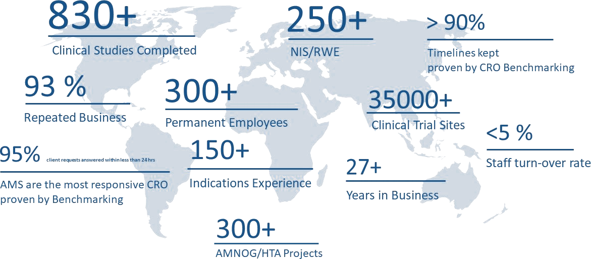 Discover our global AMS Clinical Research Team - your trusted partner for Clinical Trials. We support you from concept development to Clinical Study Report. Benefit from our expertise in Clinical Operations, Regulatory Affairs, Medical Writing, Data Management, Biostatistics, and Safety. Trust our experience to ensure the success of your clinical development.